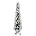 6FT Flocked Pencil Christmas Tree with 150 Warm White LED Lights – Slim Snowy PVC Tree with 358 Tips, Metal Stand, Space-Saving Design, Easy to Set Up